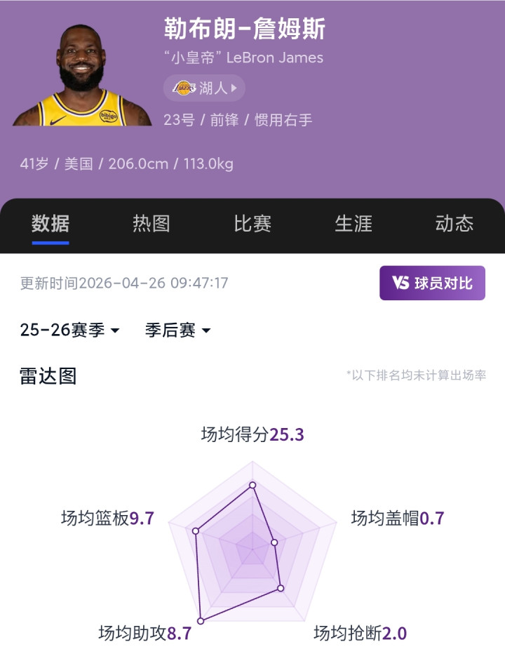 截止目前,季后赛场均25.3分9.7篮板8.7助攻,再度展现了历史级别的进攻稳定性,就连被诟病的三分命中率也达到了43%,并且季后赛的詹姆斯还提高了防守端的能量,倒地争球、关键抢断等。
